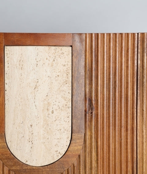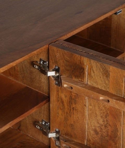 Il mobile porta TV in stile contemporaneo unisce eleganza e funzionalità, grazie alla combinazione di materiali naturali come il legno di mango e il travertino. Questo stile è ideale per chi cerca un complemento versatile e raffinato, capace di integrarsi perfettamente in qualsiasi ambiente moderno. Realizzato in legno massello di mango, travertino e MDF, questo mobile presenta una struttura robusta e smontabile. Dispone di 4 ante con vani spaziosi di 38 x 34 x 37 cm, ciascuno dotato di mensole fisse con un’altezza di 17,5 cm e una capacità di supporto di 10 kg per ripiano. Con un peso di 49,1 kg, il mobile è stabile e adatto a supportare dispositivi elettronici e altri oggetti. Le gambe misurano 5,5 x 37,5 x 15,5 cm e la distanza tra di esse è di 115 cm, garantendo una solida base. Perfetto per aggiungere un tocco etnico chic al soggiorno, combinando stile e praticità.