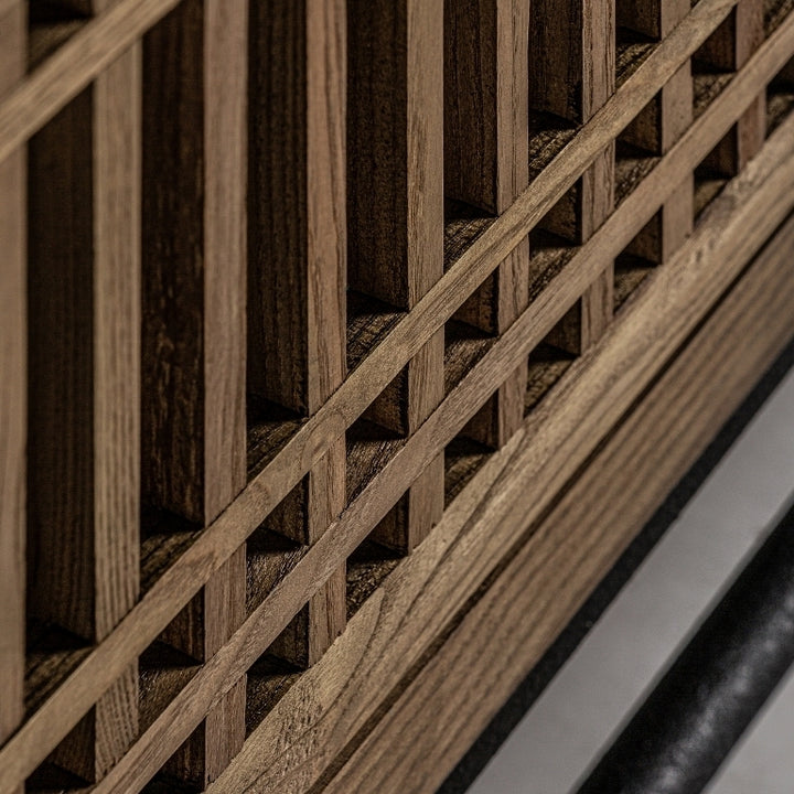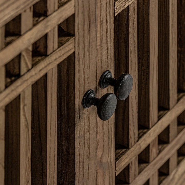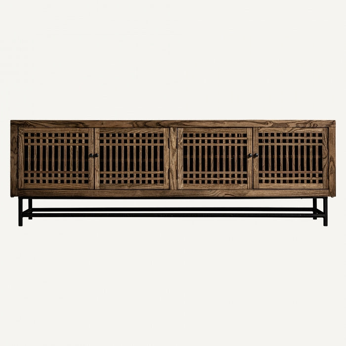 Questo mobile living è pezzo unico e artigianale, realizzato con grande cura e attenzione ai dettagli. Il legno massiccio di olmo brunito dà un aspetto naturale e caldo al mobile, e le variazioni di tonalità e imperfezioni accentuano l'unicità del prodotto. Il mobile è adatto per essere utilizzato come porta TV o buffet, e le quattro ante e due mensole offrono ampio spazio di archiviazione e di esporre oggetti decorativi. Le gambe in ferro nere aggiungono un tocco moderno e industriale al design etnico del mobile. Calore e comfort, oltre a una sensazione di autenticità e originalità grazie alla sua realizzazione artigianale, la bellezza naturale e l'attenzione per i dettagli rendono questo mobile un'aggiunta meravigliosa a qualsiasi ambiente.
