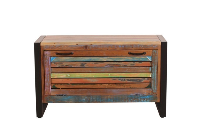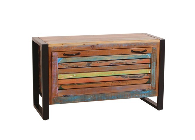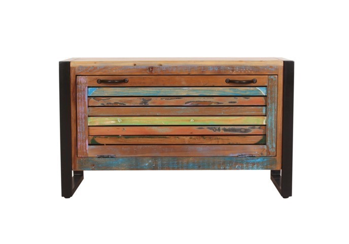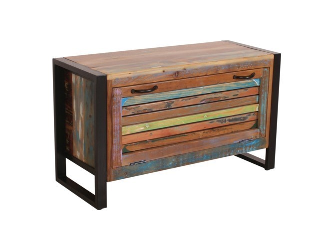 Mobili realizzati con legno riciclato trattato e recuperato per creare ambienti con uno stile industrial allegro e colorato.