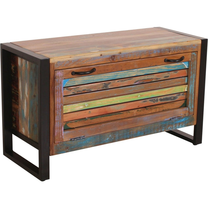 NOTE: Legno massello di recupero multicolor, struttura in ferro nero, dimensioni 85×35×50 cm, peso 25 kg, 1 anta e 2 ripiani, capacità circa 6 paia di scarpe. Ogni pezzo è unico, con variazioni di colore e finitura dovute alla lavorazione artigianale.