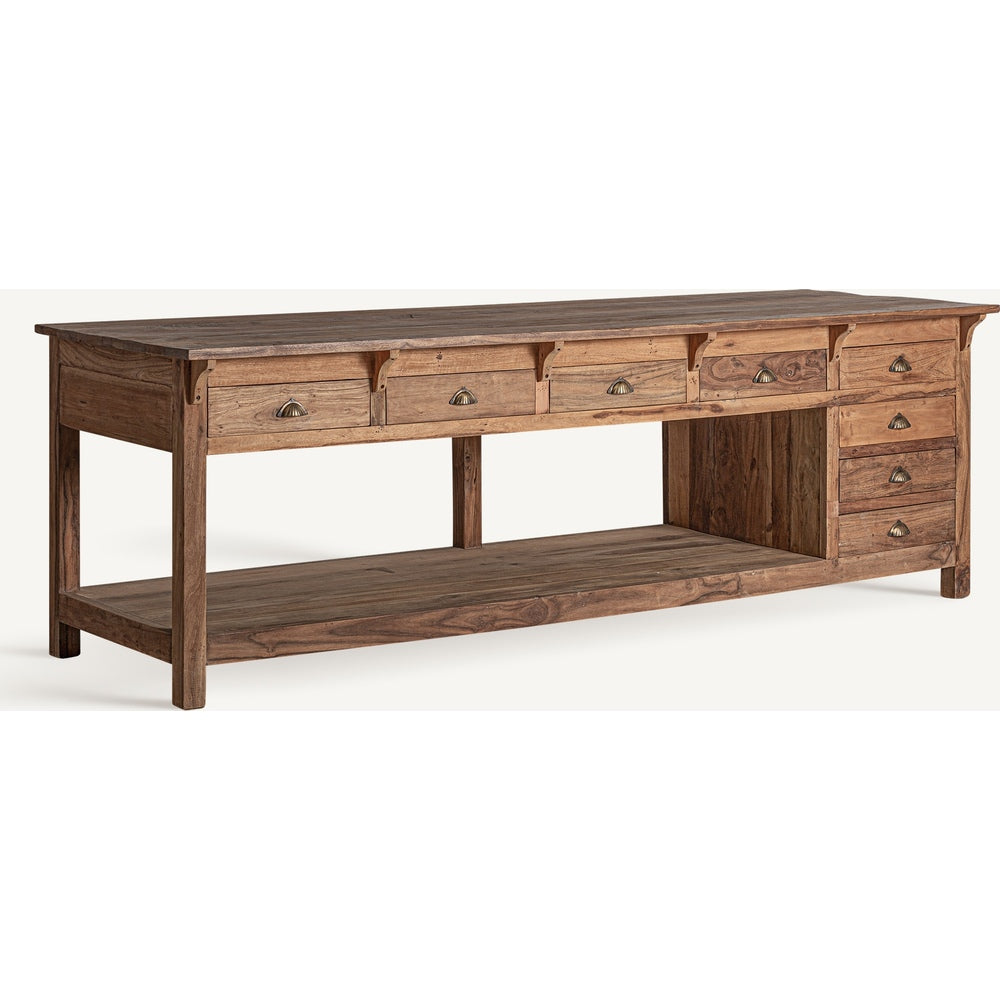 La Scrivania Consolle Country esprime il fascino autentico dello stile country, combinando materiali naturali e linee semplici per creare un arredo accogliente e funzionale. Realizzata artigianalmente in legno massello di recupero con finitura marrone, si distingue per solidità e versatilità. Dotata di otto cassetti (43x38x9 cm) e un ampio vano centrale da 202x70x44 cm, offre uno spazio organizzato e pratico per documenti, accessori o strumenti da lavoro. Il piano spesso 2,5 cm e la struttura robusta assicurano durata nel tempo, mentre le imperfezioni naturali del legno rendono ogni pezzo unico. Perfetta per ambienti country chic o spazi coloniali, è proposta con sconti fino al 70% su Ethnic Chic. Un arredo di pregio che unisce design rustico e funzionalità moderna.