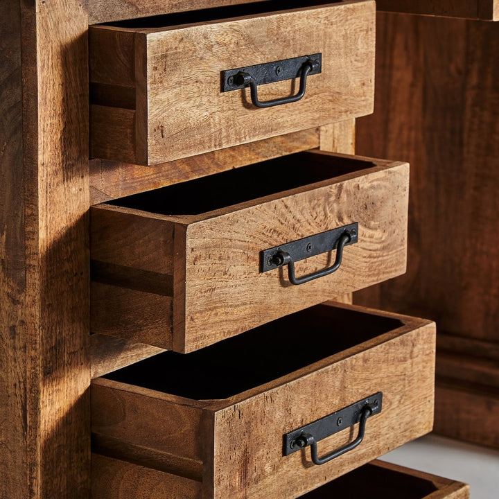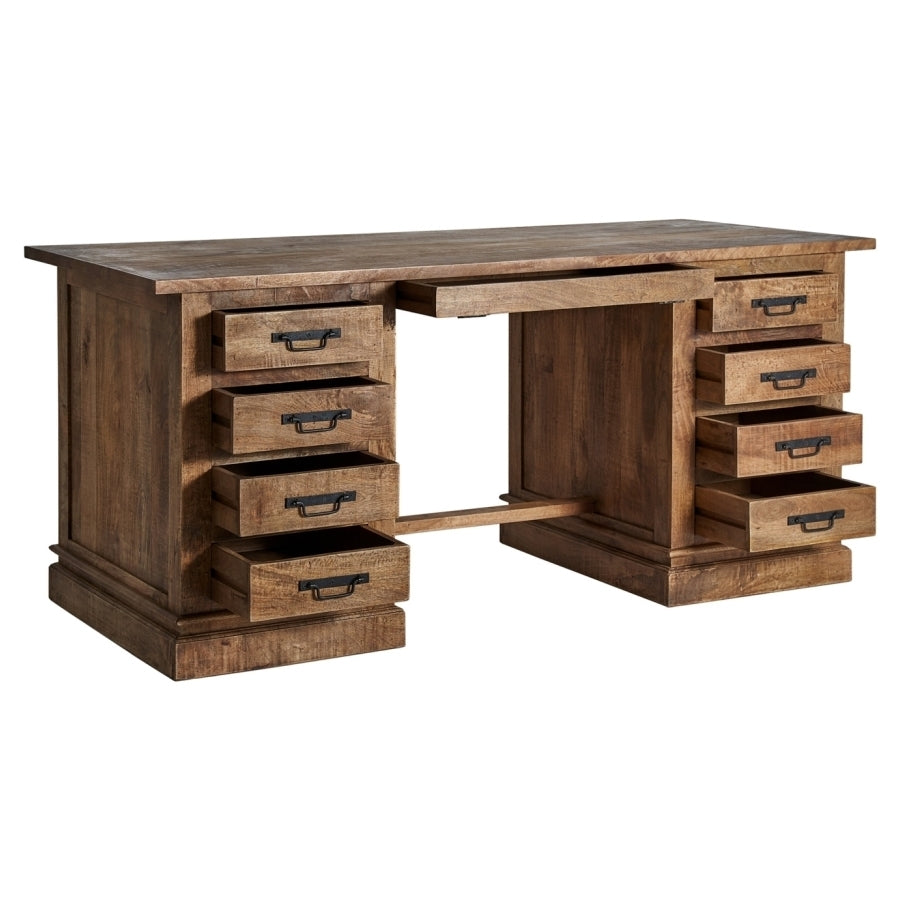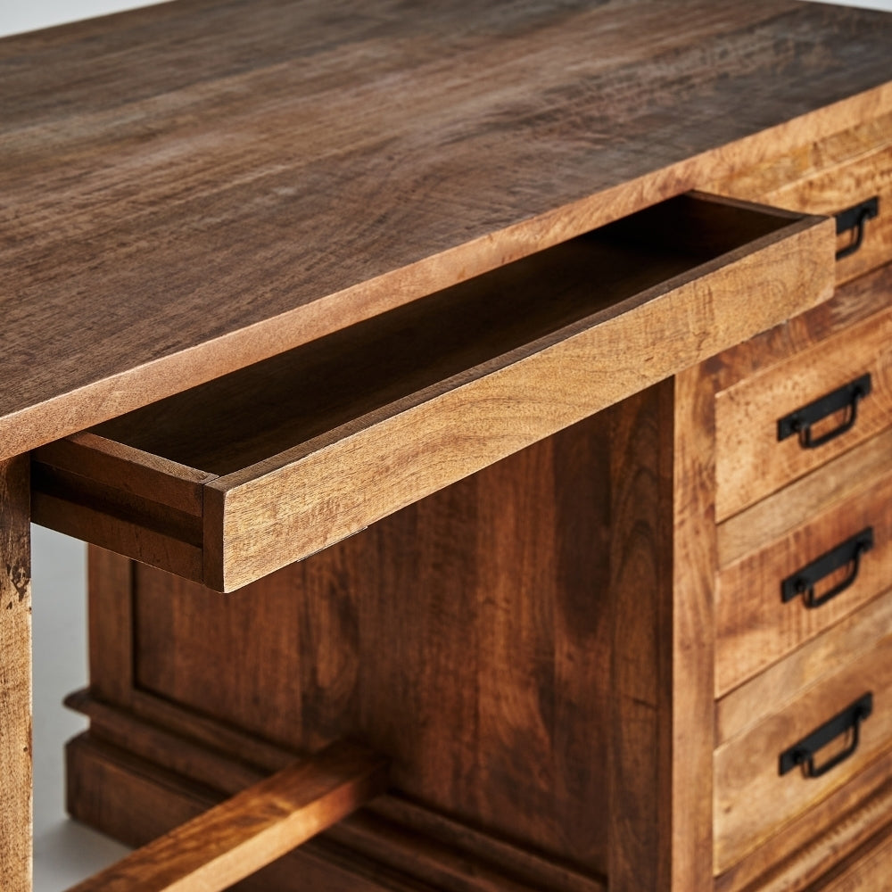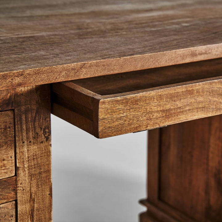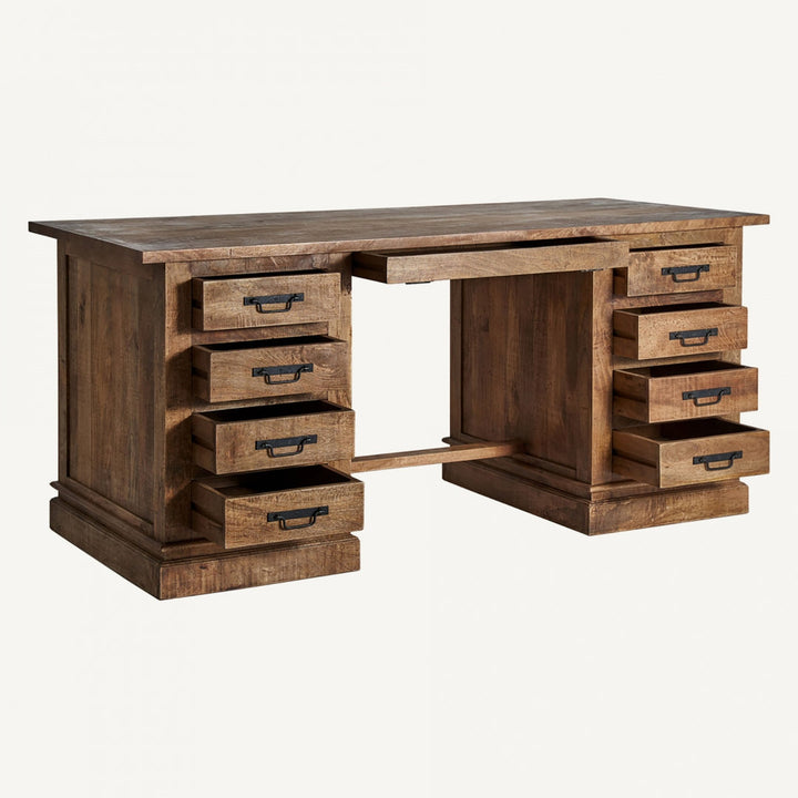 Questa elegante realizzazione in legno di mango si distingue per la sua robustezza e le sue linee raffinate. Con nove cassetti di diverse dimensioni, offre ampio spazio di archiviazione. La sua struttura solida permette di sostenere un peso fino a 70 kg, rendendola ideale per qualsiasi utilizzo, sia in un ufficio che in una stanza. Le sue gambe con uno zoccolo di 8 cm e la distanza tra di loro di 70 cm offrono stabilità e un aspetto distintivo. L'attenzione al dettaglio è evidente anche nello spessore del piano di 2,5 cm e nella spaziatura tra le cassettiere, che fornisce ulteriore spazio. La sua finitura naturale e la qualità del legno di mango lo rendono un pezzo di arredamento che può durare nel tempo.