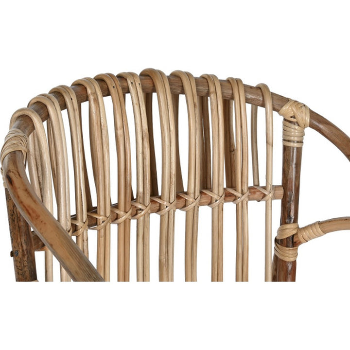 NOTE: Bamboo naturale, rattan intrecciato, cuscino imbottito, altezza seduta 58 cm, uso interno/esterno, design leggero e resistente.