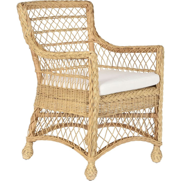 NOTE: Rattan naturale intrecciato, cuscino imbottito incluso, altezza seduta 51 cm, uso interno/esterno coperto, realizzazione artigianale.