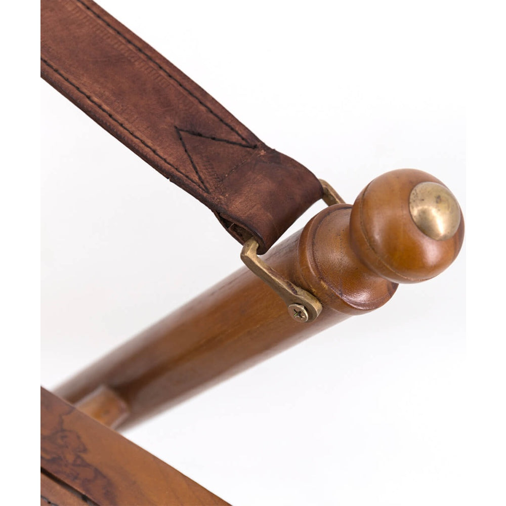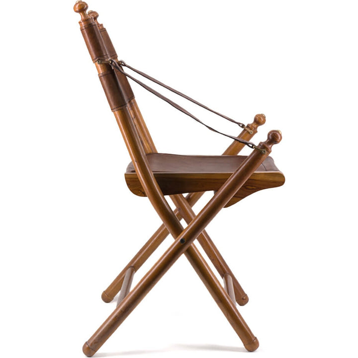 NOTE: Teak massello, pelle, accessori oro, sedia pieghevole, pronta all’uso, seduta 45 cm, braccioli 55 cm, lavorazione artigianale.