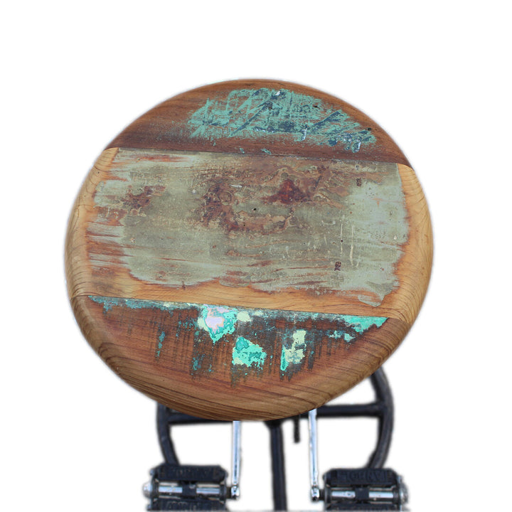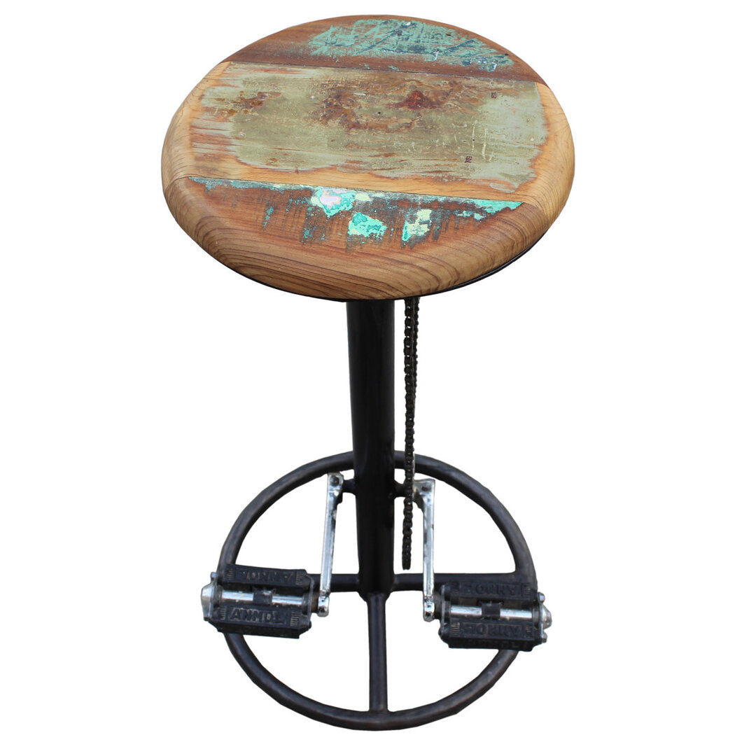 40 x 40 x H 83 cm, 10.3 Kg Questo sgabello è un complemento d’arredo unico che unisce l'eleganza dello **stile industriale** con materiali di alta qualità. Il sedile in **legno massello di mango** riciclato, verniciato a colori e arricchito da segni di usura intenzionali, si abbina alla struttura in acciaio con finitura anticata. La catena di bicicletta riciclata funge da elemento decorativo e collega il telaio al sedile, mentre i pedali della bicicletta diventano originali poggiapiedi. Perfetto per aggiungere un tocco vintage alla cucina, al bar di casa o al corridoio, questo sgabello porta una **moderna atmosfera da loft** tra le vostre quattro mura. L’abbinamento tra la struttura in metallo e la calda seduta in legno massello esprime il carattere grezzo e autentico dello stile industriale moderno. Ideale anche per ristoranti moderni, dove diventa un elemento d’arredo capace di attirare l’attenzione.