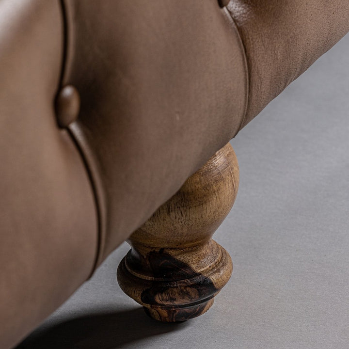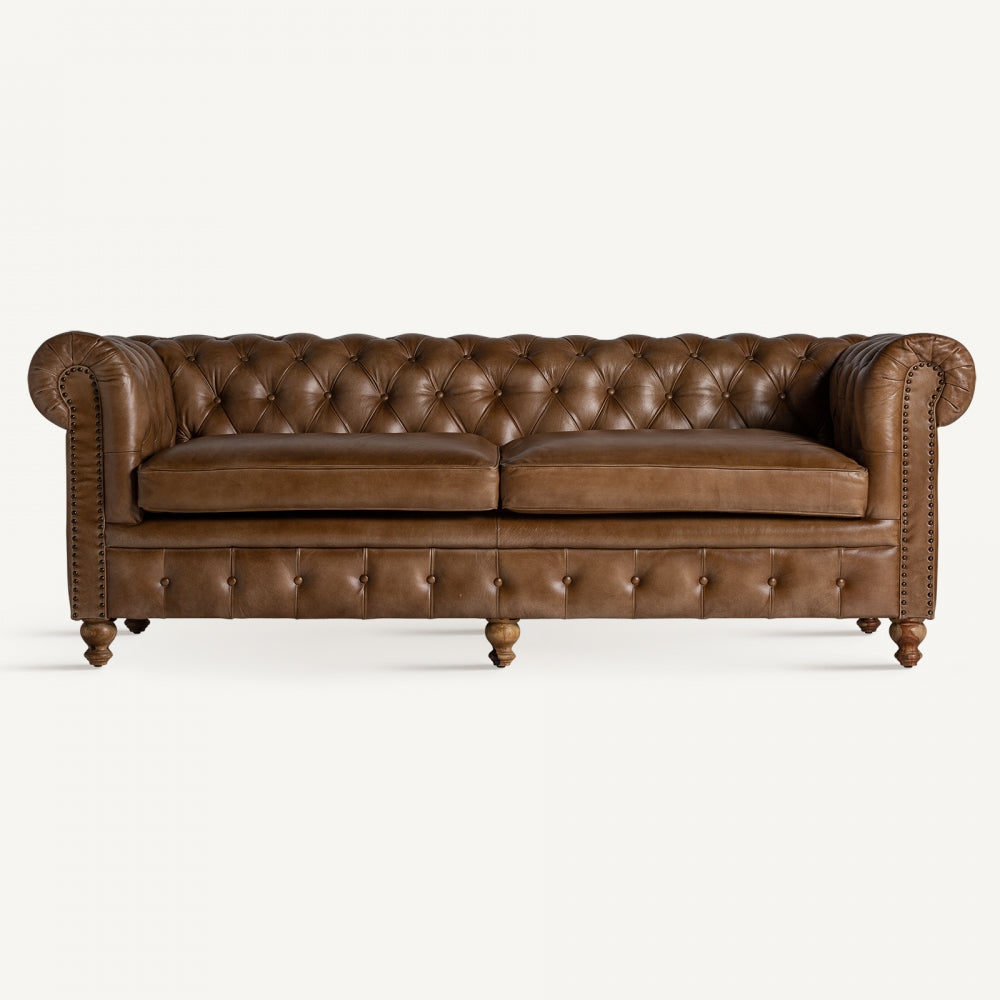 Aggiungi un tocco di classe e comfort senza tempo al tuo spazio con il nostro Sofà Capitonné Marrone di stile vintage. Questo sofisticato pezzo d'arredamento unisce la bellezza senza tempo dello stile vintage con materiali di alta qualità per offrire una seduta lussuosa.