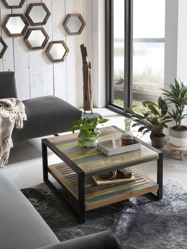 Mobili realizzati con legno riciclato trattato e recuperato per creare ambienti con uno stile industrial allegro e colorato.