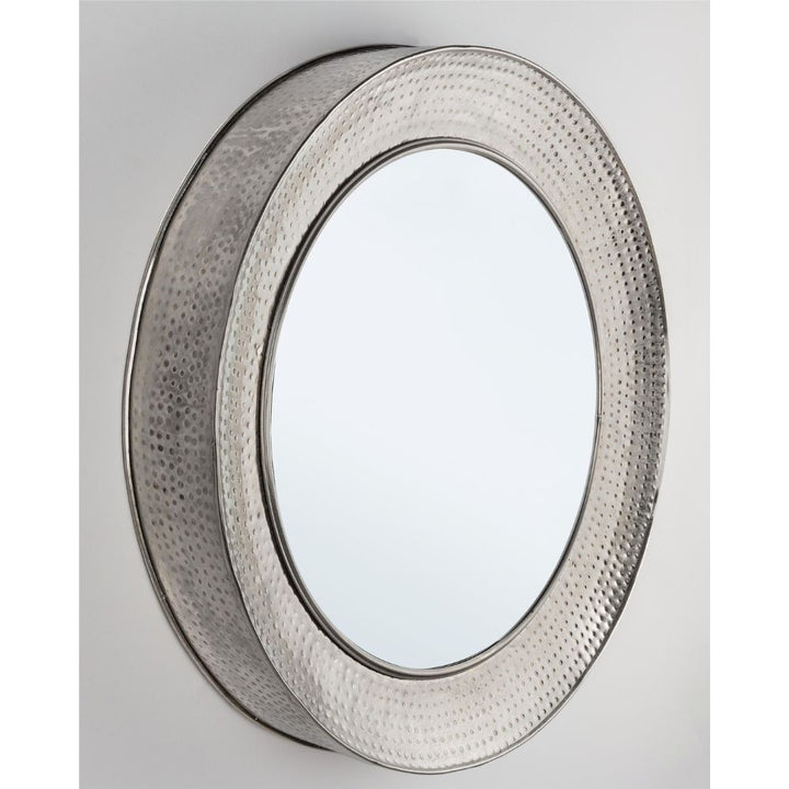 Uno specchio dallo stile glam e contemporaneo, perfetto per ambienti che desiderano un tocco moderno con materiali riflettenti e finiture sofisticate. Realizzato in acciaio con finitura nickel, presenta una cornice ampia e martellata che dona texture e brillantezza. Il diametro utile dello specchio è Ø70 cm, ideale per riflettere la luce e amplificare gli spazi. Ogni pezzo è unico grazie alla lavorazione artigianale, con leggere irregolarità che ne valorizzano l'estetica. Perfetto per ambienti in stile glamour, industriale o moderno, si adatta con eleganza a soggiorni, camere o ingressi. Un complemento luminoso e di carattere per arredare con stile.