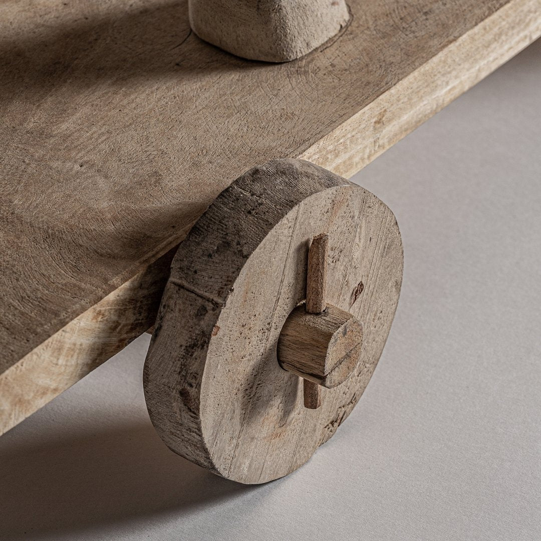 Questa affascinante scultura potrebbe ricordare una reinterpretazione moderna del Cavallo di Troia, con il suo stile unico e rustico. Realizzato in legno di teak, con una finitura naturale che enfatizza le venature e le imperfezioni del legno, questo cavallo su ruote è un'opera d'arte capace di donare calore e autenticità agli spazi. Le ruote decorative e il design artigianale rendono questa figura perfetta per arredare soggiorni, ingressi o spazi creativi, creando un'atmosfera accogliente e ricca di personalità. Ogni pezzo è unico, con variazioni di tono e piccole imperfezioni che aggiungono valore e originalità alla scultura. Ideale per chi desidera un elemento distintivo e senza tempo, capace di arricchire l’arredamento con un tocco autentico.