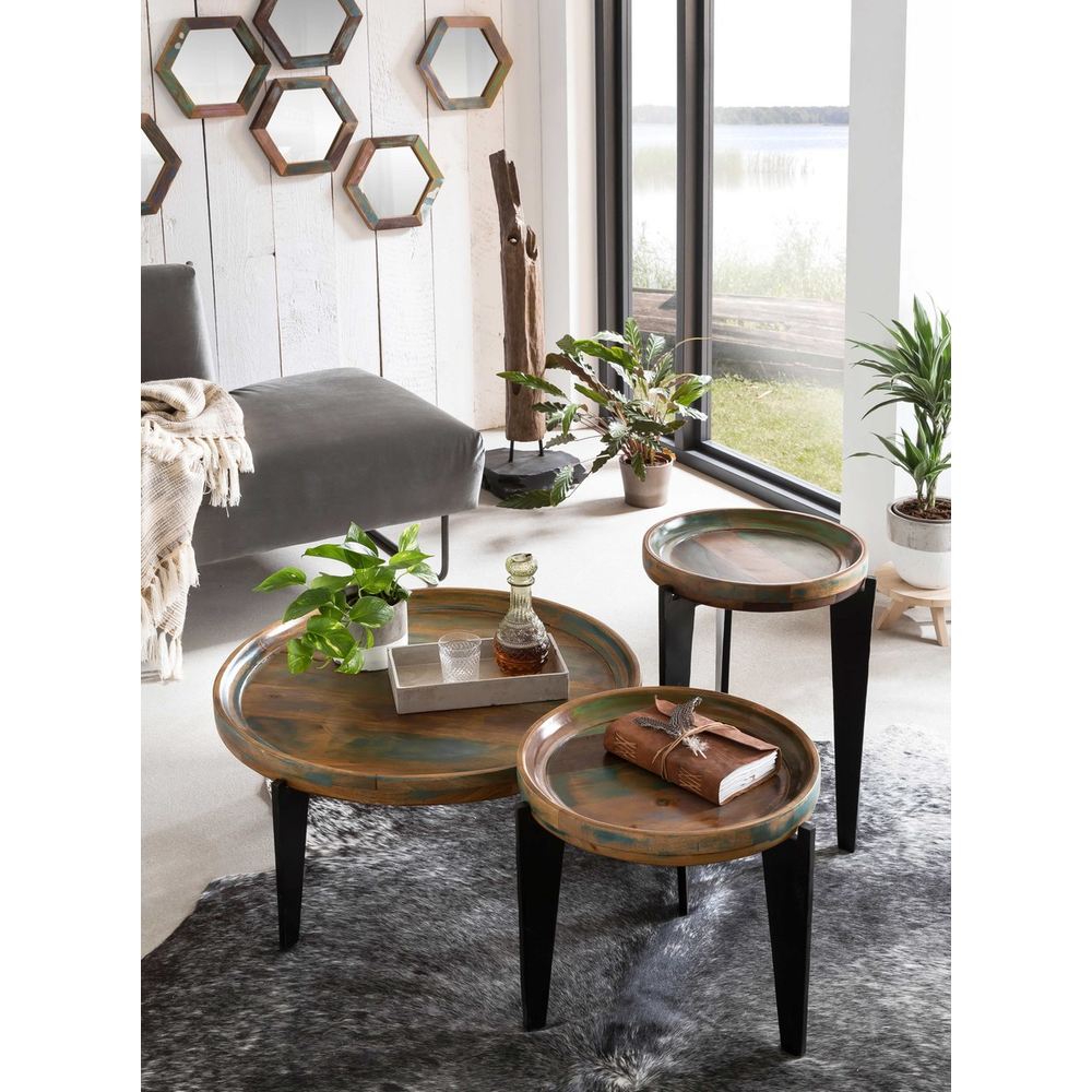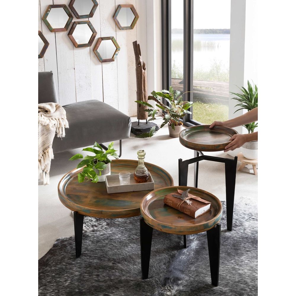 Il tavolino basso industrial color rappresenta un perfetto equilibrio tra design e artigianalità. Realizzato in legno di recupero multicolor con piatto removibile in legno e base a tre gambe in ferro nero, è un complemento d’arredo unico per soggiorni moderni o spazi dal gusto industrial chic. Ogni pezzo è irripetibile, con tonalità differenti che raccontano la storia del legno riciclato. Si abbina perfettamente ad altri tavolini di lusso in legno massello o agli arredi scontati Ethnic Chic fino al 70%. Per dettagli su spedizione e assistenza visita la pagina Servizio Clienti.