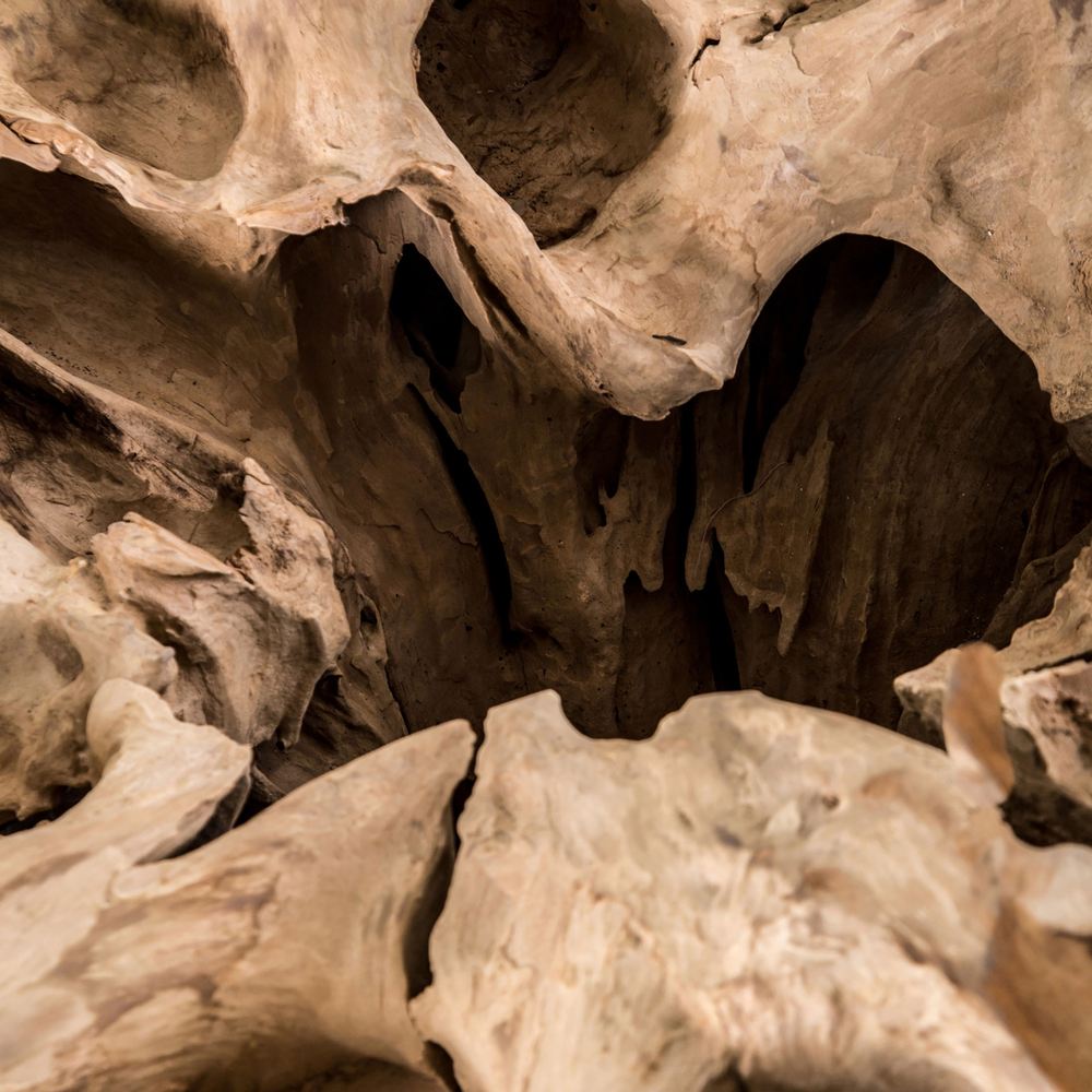 NOTE: Base in radice di teak naturale, finitura marrone invecchiato, piano in vetro da 1 cm di spessore, peso 115 kg, parti smontabili, leggere variazioni di dimensione e colore dovute alla lavorazione artigianale.
