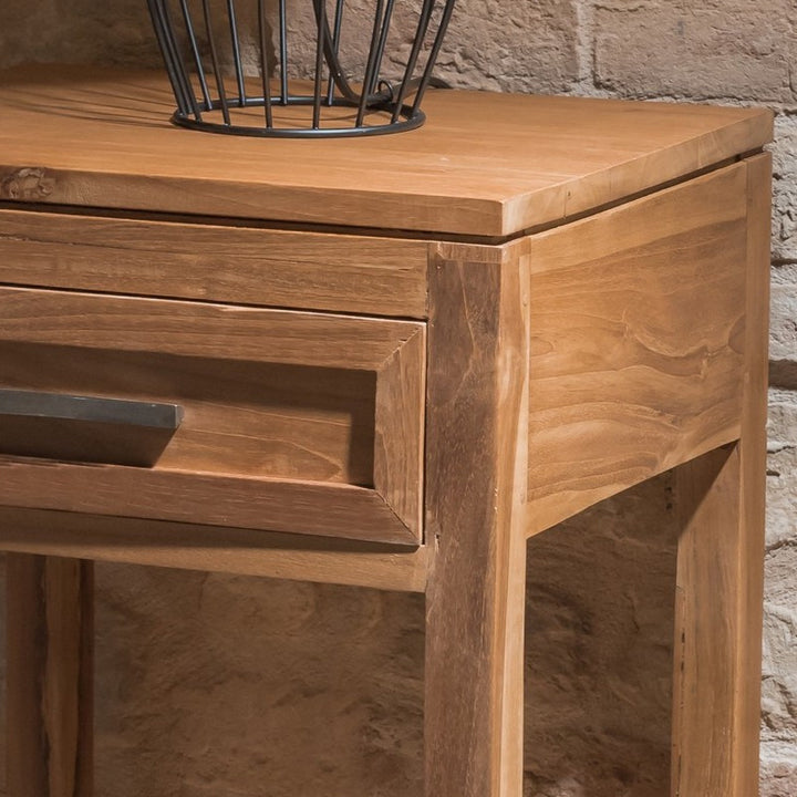 Scopri l'autentica eleganza del Tavolino Country Chic, realizzato interamente a mano in legno massello di teak naturale. Questo versatile mobiletto, con le sue dimensioni di 40 cm di larghezza, 35 cm di profondità e 80 cm di altezza, è perfetto sia come comodino che come tavolino aggiuntivo, offrendo un cassetto e un ripiano per massimizzare la praticità. La finitura a cera naturale non solo preserva le caratteristiche intrinseche del teak, come il suo colore dorato e la capacità di auto-lubrificazione, ma ne esalta anche le venature, conferendo al mobile un aspetto caldo e accogliente. Disponibile anche nella versione bianco decapato CON UN SUPPLEMENTO DEL 20%, questo pezzo è frutto di una lavorazione artigianale che utilizza tecniche specifiche per mettere in evidenza le venature naturali del legno. Ideale per arricchire spazi in stile classico, rustico, etnico o shabby chic, questo tavolino rappresenta una scelta d'arredo di qualità e stile. Esplora la nostra selezione di comodini naturali online per trovare la soluzione perfetta per il tuo spazio.