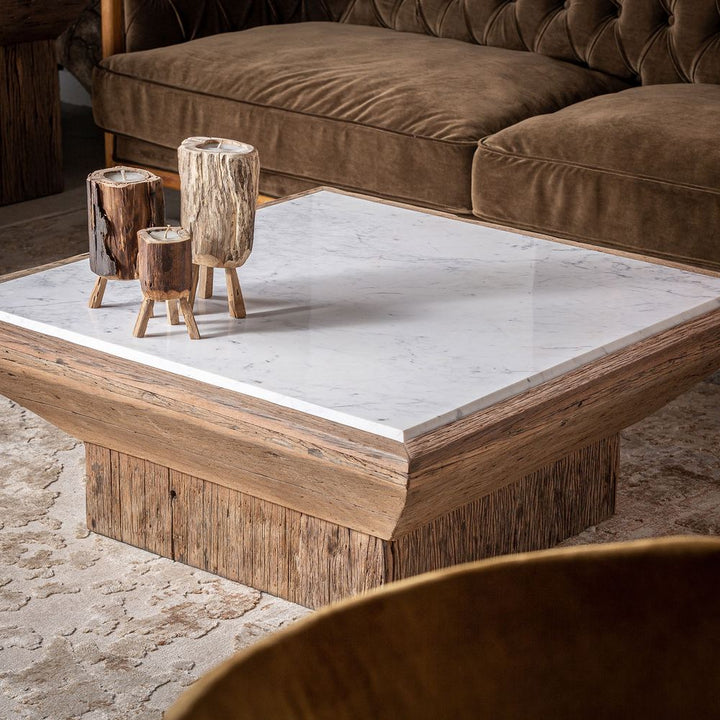 Tavolino Rustico Quadrato in Legno di Pino Riciclato e Marmo Bianco
