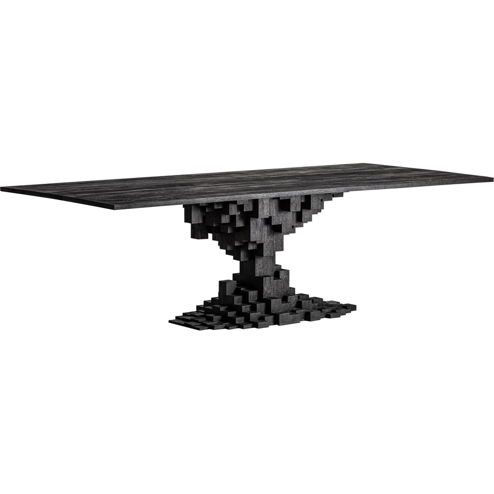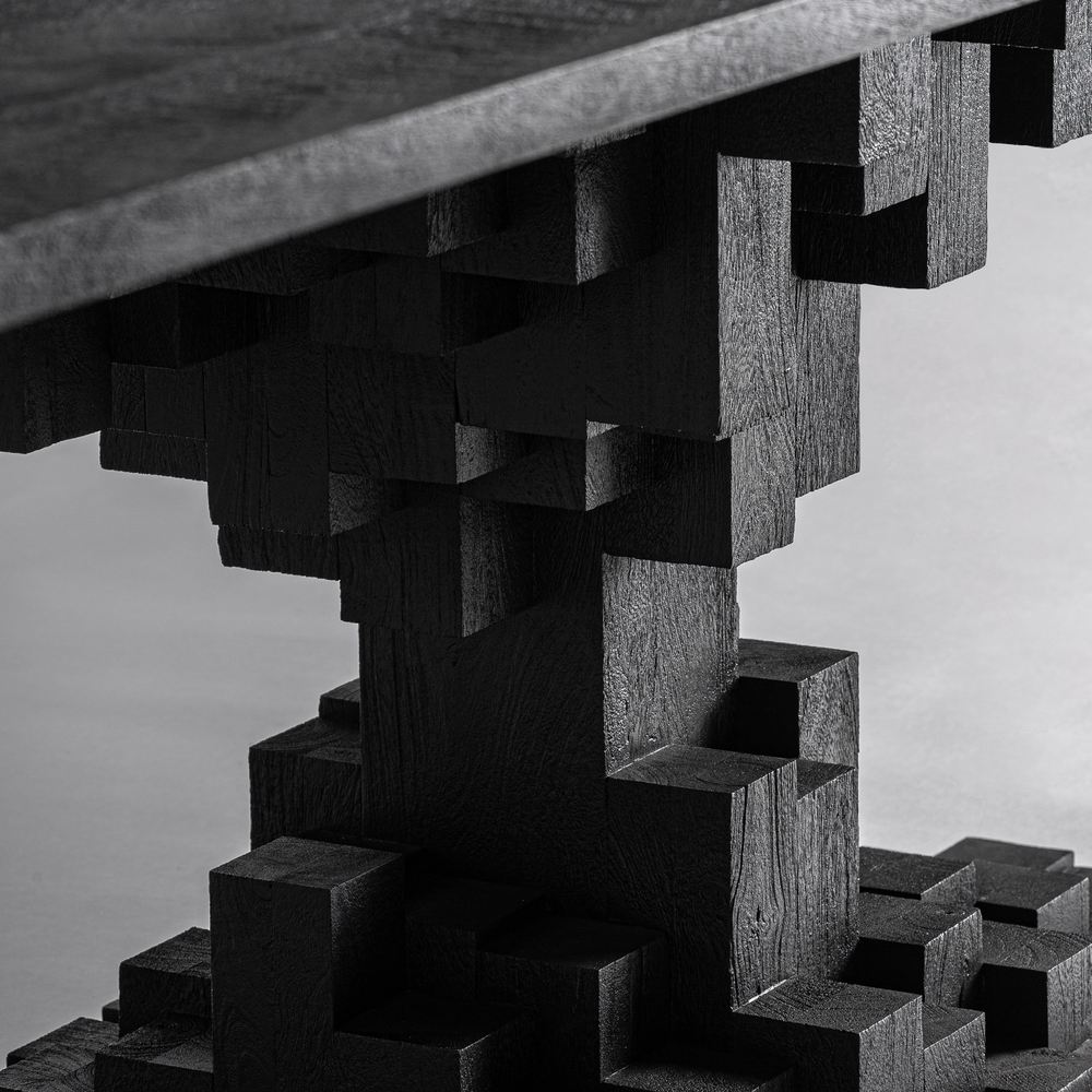 Lo stile brutalist di lusso si esprime attraverso forme architettoniche e volumi monumentali, creando ambienti di forte impatto visivo. Il tavolo Eclipse in legno di mango nero interpreta questo linguaggio con una base centrale scultorea ispirata a strutture voxel e geometrie digital-organic, evocando la forza materica della pietra vulcanica. La finitura sabbiata e scura richiama l’estetica del legno bruciato, rendendolo perfetto per sale da pranzo contemporanee, loft, ville e ambienti hospitality di alto livello.