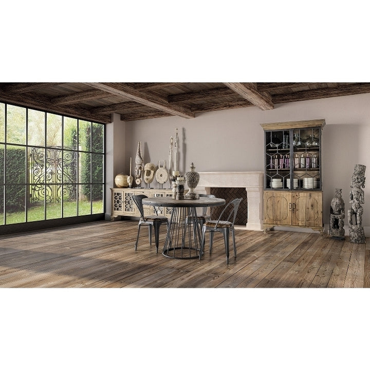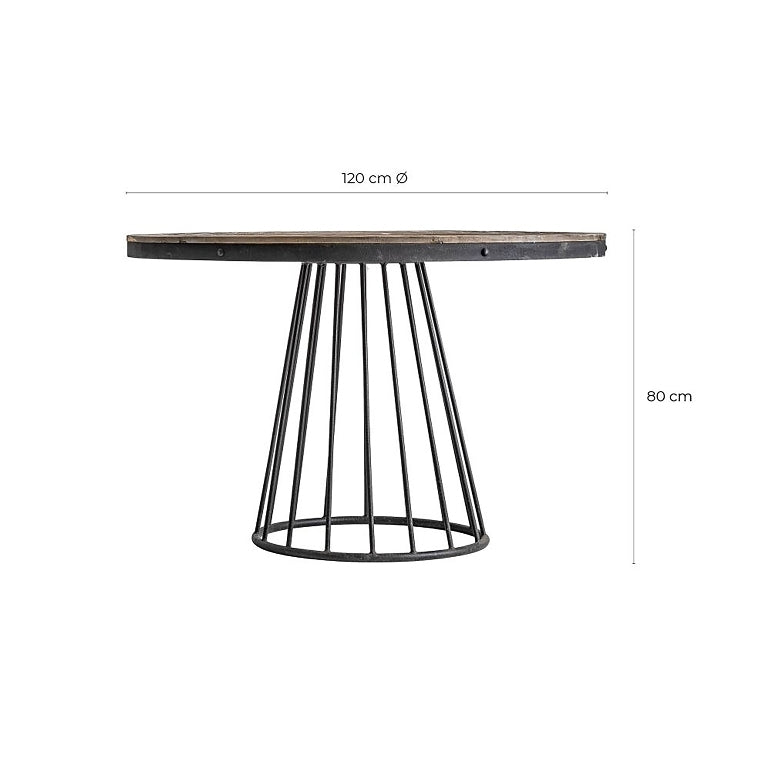 Questo tavolo rotondo combina un design robusto con materiali sostenibili, il tutto in uno stile unico e affascinante.