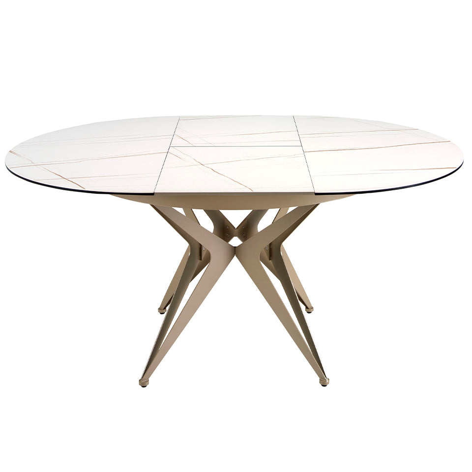 Tavolo da pranzo rotondo allungabile dal design moderno con piano in marmo porcellanato bianco con venature marroni in finitura opaca. Le sue gambe in acciaio inossidabile verniciate color champagne, così come la sua adattabilità, lo rendono un mobile completamente funzionale e versatile per l'uso quotidiano.