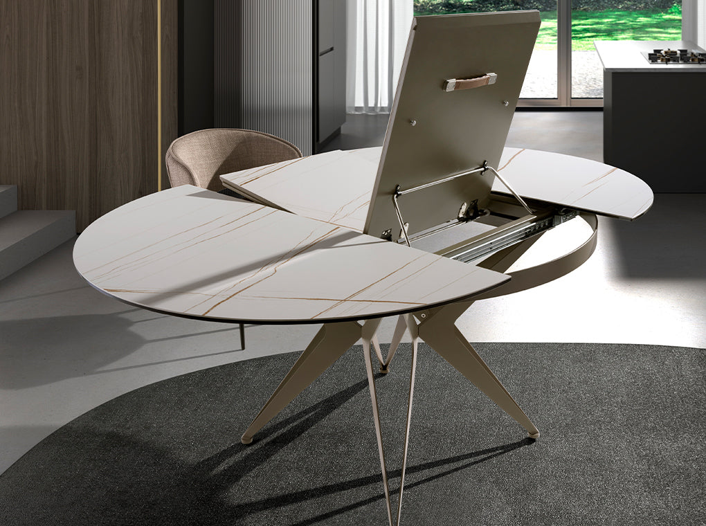 Tavolo da pranzo rotondo allungabile con base in acciaio e piano in marmo porcellanato
