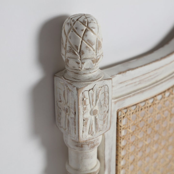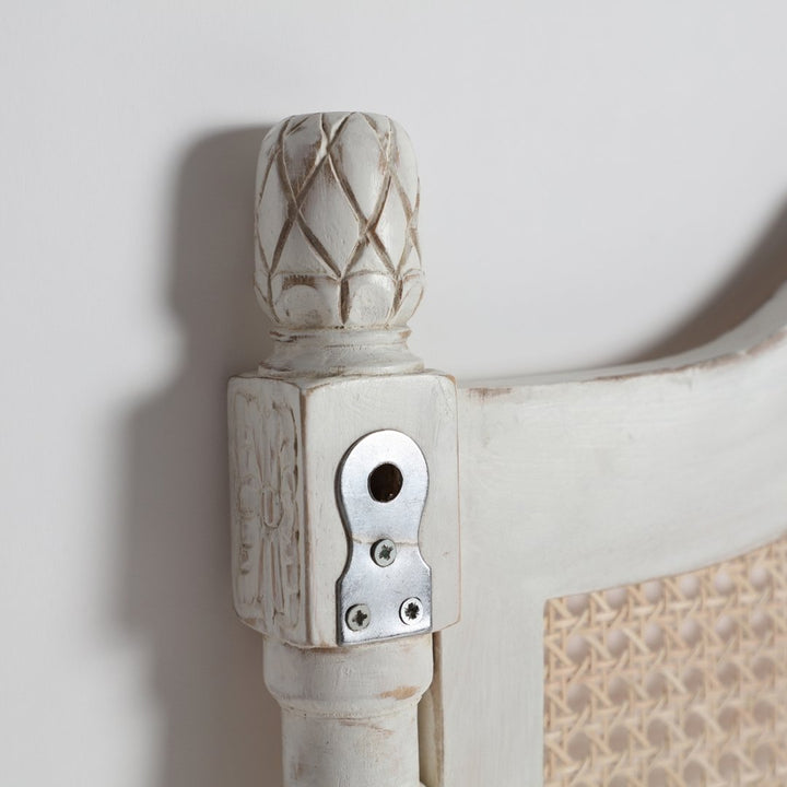La testata letto shabby chic in legno di mango bianco anticato con inserti in rattan è un elemento d'arredo essenziale per chi desidera conferire un'atmosfera romantica e accogliente alla propria camera da letto. Questa testata, dalle dimensioni generose di 190 cm di larghezza, 5 cm di profondità e 118 cm di altezza, è ideale per letti da 180 cm, offrendo una soluzione di stile per camere ampie e luminose. Il suo peso di 9,2 kg e le gambe di 7x7x20 cm assicurano stabilità e facilità di montaggio, con una distanza tra le gambe di 176 cm. Incluso nel prodotto, troverete l'ancoraggio a parete con piastra e viti per un fissaggio sicuro e affidabile. La combinazione di legno di mango e rattan non solo apporta un tocco di eleganza vintage, ma anche garantisce durata e resistenza. La pulizia è semplice, richiedendo solo un panno sintetico e una miscela di acqua tiepida e sapone delicato per mantenere la testata sempre splendente e accogliente.