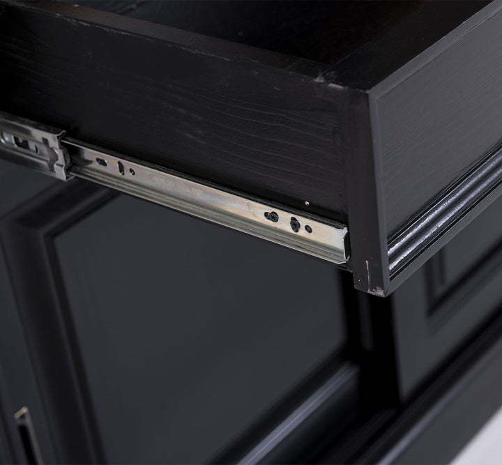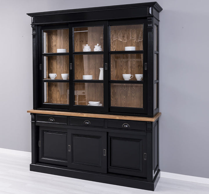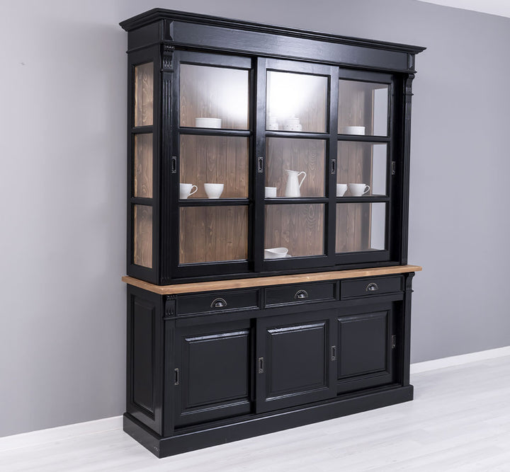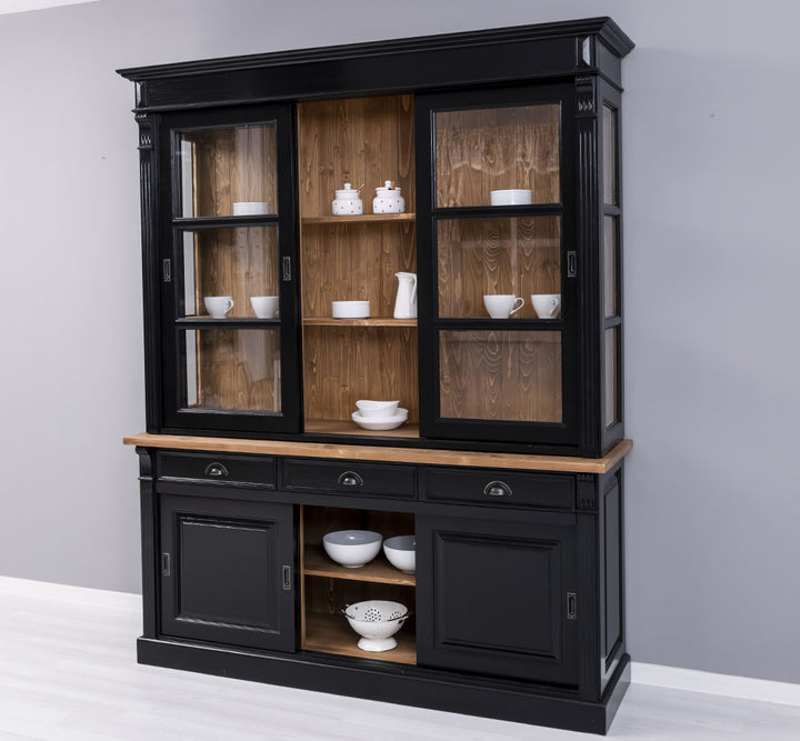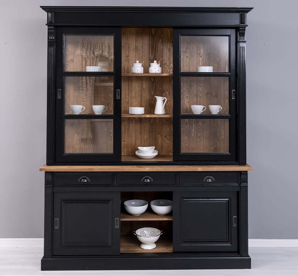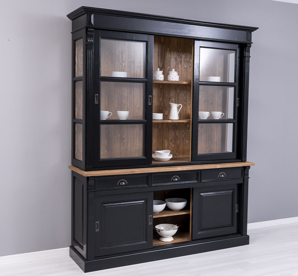 Questa elegante vetrina in stile provenzale country chic si distingue per la sua colorazione nera con piano e schienale interni in legno naturale, conferendo un tocco sofisticato e accogliente. Realizzata in legno massello di pino al 100%, è progettata per garantire una lunga durata e una resistenza eccezionale. La vetrina arriva in due sezioni che si sovrappongono facilmente, offrendo una struttura solida e stabile. Nella parte superiore, dietro le 3 grandi porte scorrevoli in vetro e i lati in vetro, offre uno spazio di presentazione luminoso per esporre oggetti decorativi, stoviglie o libri. La parte inferiore, invece, è dotata di 3 porte scorrevoli in legno e 3 cassetti, perfetti per organizzare e riporre accessori e oggetti di uso quotidiano, mantenendo l’ambiente in ordine.
