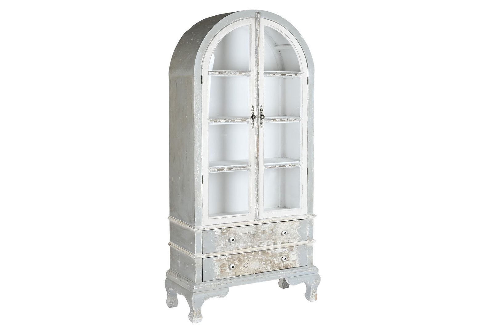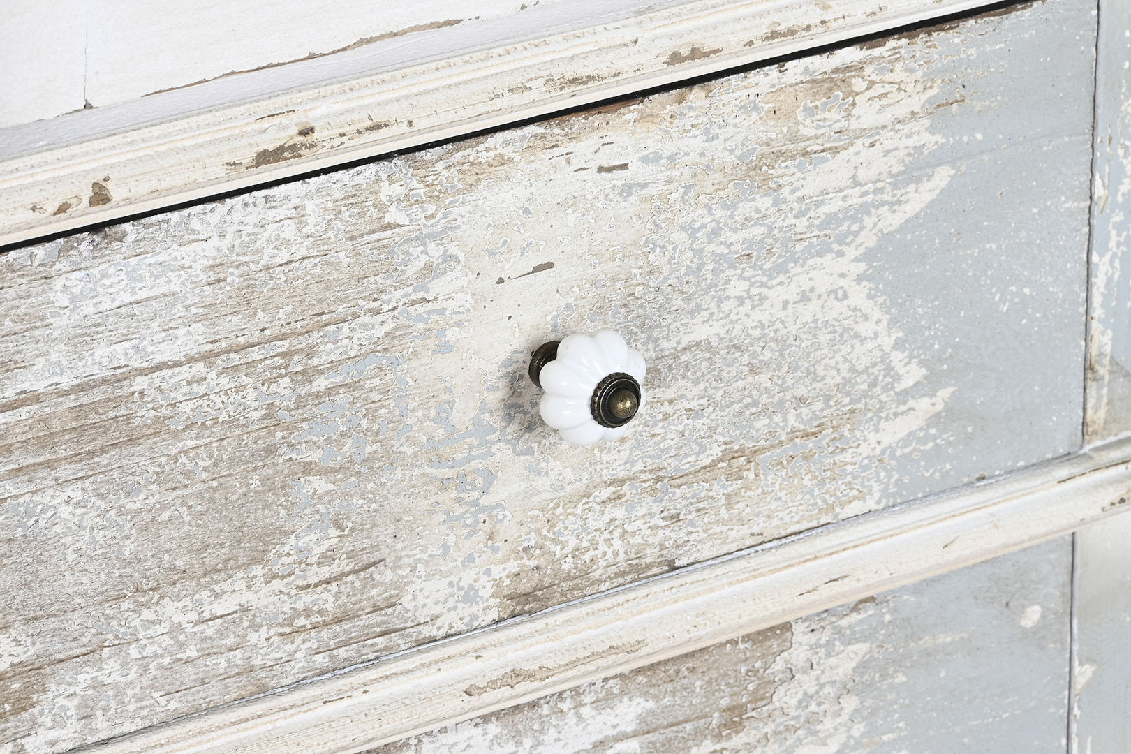 Finitura, completamente realizzata artigianalmente, esterno decapato in grigio e bianco vintage, maniglie in bronzo e porcellana bianca.