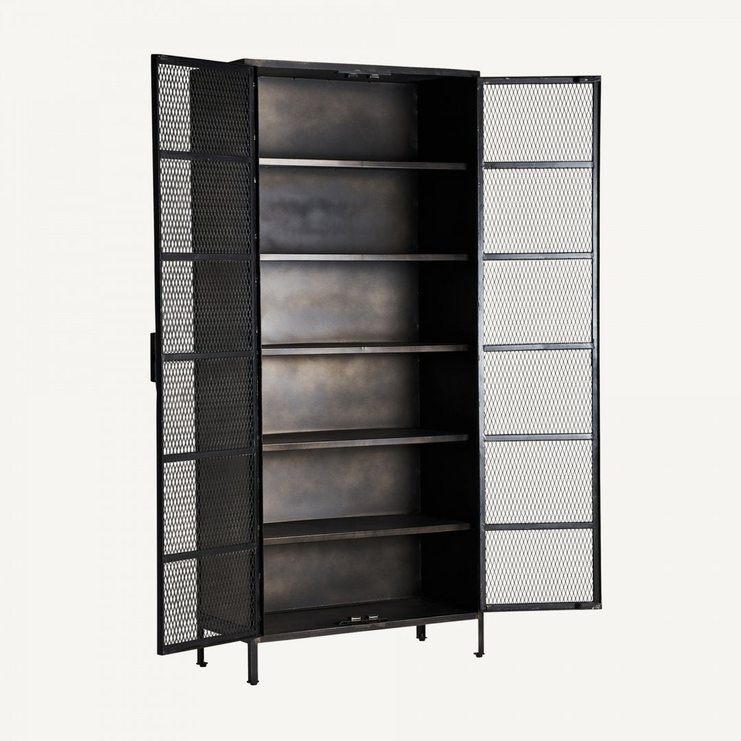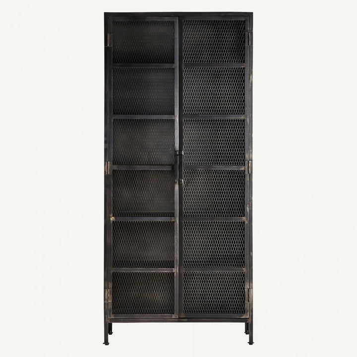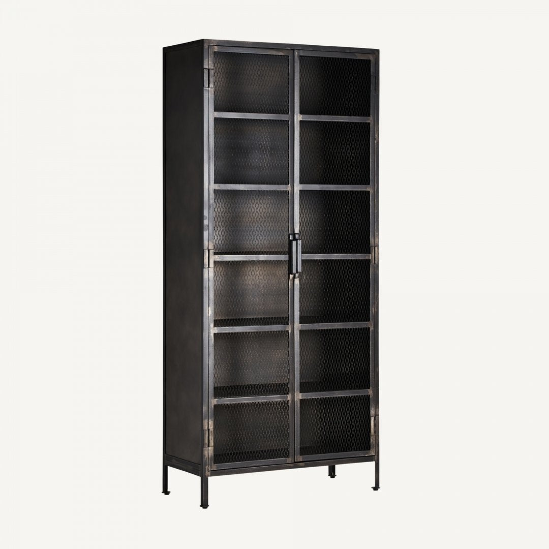 Vetrina in legno di mango e ferro dalle dimensioni di 90 x 42 x 201 cm. Il suo peso è di 83,2 kg. Dispone di due porte e un ampio spazio interno con misure di 84 x 36,5 x 182 cm. La vetrina è dotata di cinque ripiani fissi con un'altezza tra di essi di 28 cm. Ogni ripiano può sostenere un peso massimo di 15 kg. Le piccole e regolabili gambe misurano 2,5 x 2,5 x 13,5 cm e offrono stabilità. Lo spazio tra le gambe è di 85 cm in lunghezza e 35 cm in larghezza. Il piano ha uno spessore di 0,3 cm e può sostenere un peso massimo di 70 kg. La vetrina include anche il kit di ancoraggio a parete per una maggiore sicurezza.
