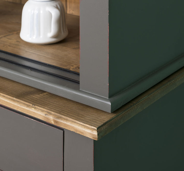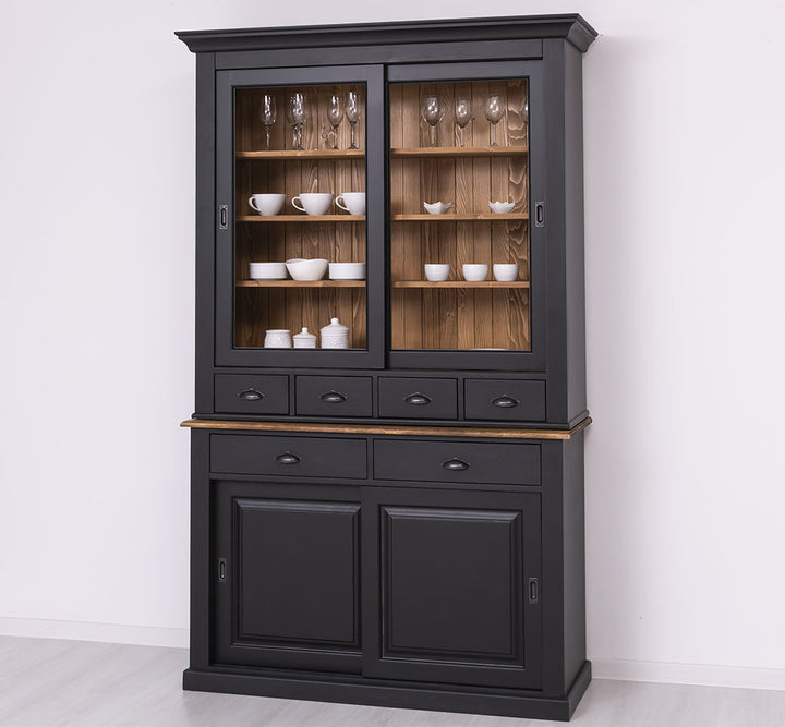 Porta il fascino dello stile country noir nella tua casa con questa elegante vetrina libreria, perfetta per arredamenti raffinati e accoglienti. Realizzata in legno massello di pino al 100%, si distingue per la finitura nero opaco che dona un tocco sofisticato a qualsiasi ambiente. La parte superiore è dotata di due ante scorrevoli in vetro, ideali per esporre libri, piatti o oggetti decorativi. La parte inferiore presenta cassetti spaziosi e ante scorrevoli per un pratico spazio di archiviazione. Questo mobile è perfetto per chi cerca una soluzione funzionale ed elegante, disponibile su misura e con colori personalizzabili. Facile da pulire con un panno umido, garantisce qualità e durata nel tempo.