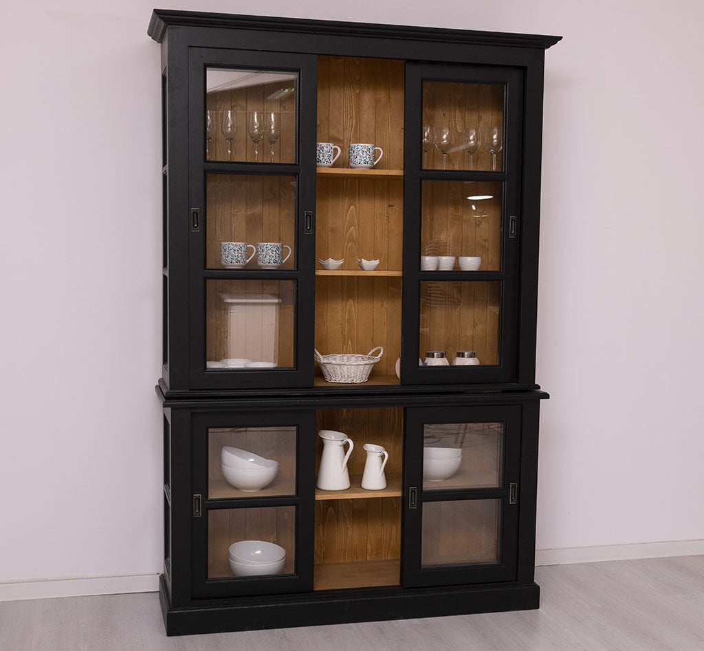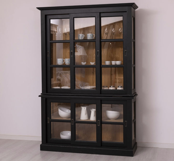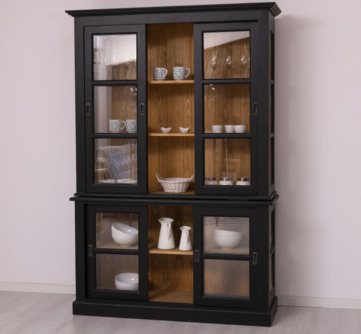 Porta l’eleganza rustica dello stile cottage country nella tua casa con questa vetrina nera realizzata in legno massello di pino 100%. Il contrasto tra la struttura esterna in nero opaco e l'interno in legno naturale crea un effetto visivo accattivante, perfetto per ambienti che combinano tradizione e modernità. Con sei ante scorrevoli in vetro e un ampio spazio interno, questa vetrina è ideale per esporre stoviglie, bicchieri o oggetti decorativi. I lati in vetro aggiungono luminosità, mettendo in risalto i tuoi oggetti preferiti. La costruzione solida e i materiali di alta qualità garantiscono durata e resistenza nel tempo. La vetrina arriva in due sezioni già montate, pronte per essere assemblate facilmente. Perfetta per chi cerca vetrine in stile cottage country online, questo mobile unisce estetica e funzionalità per arricchire il tuo arredamento con un tocco di classe e praticità.