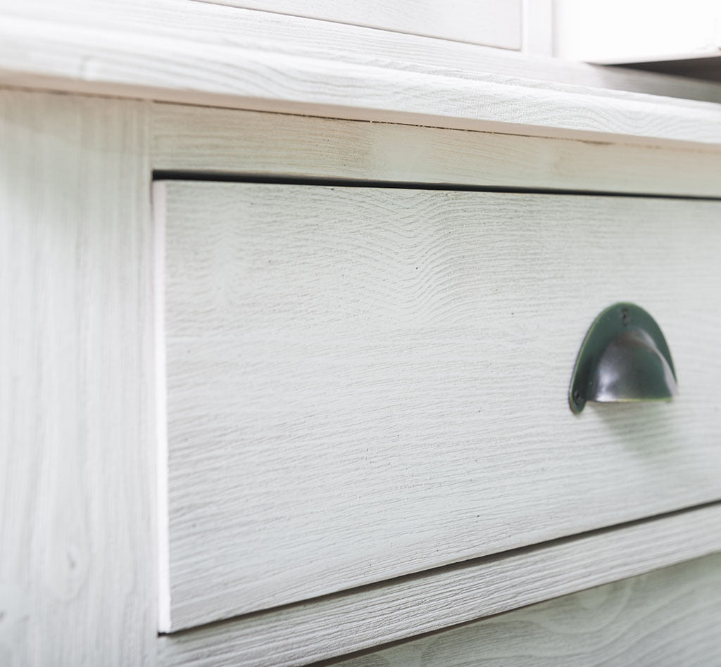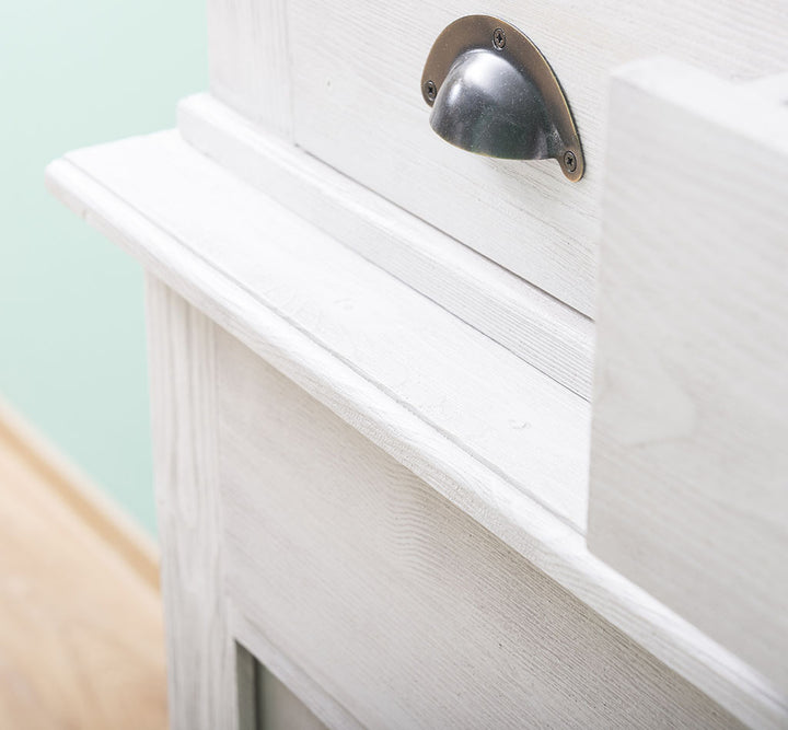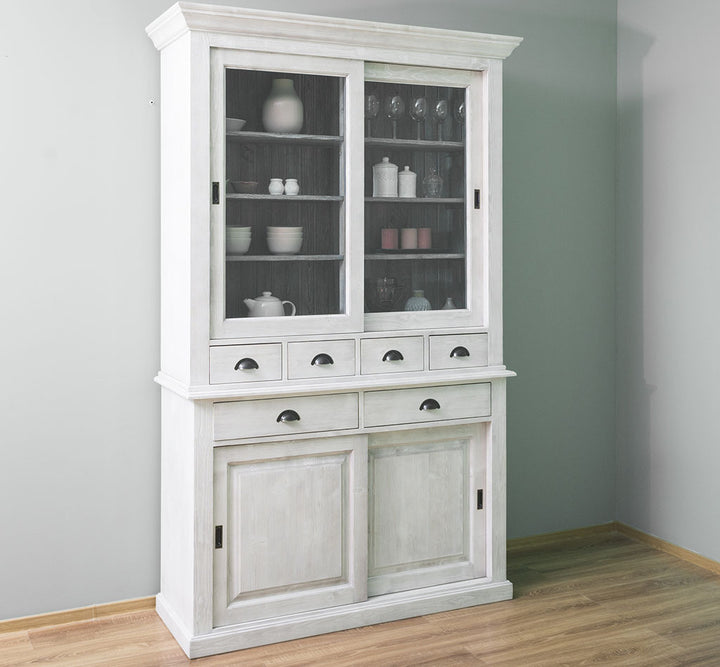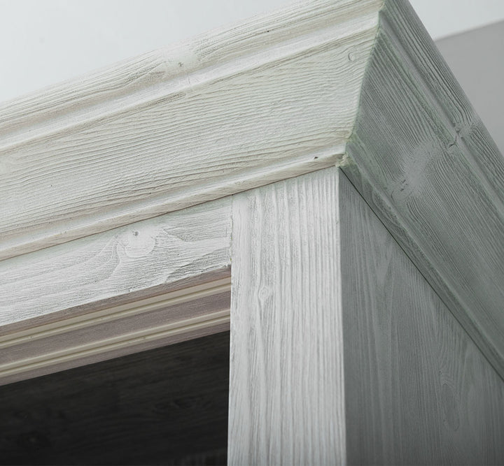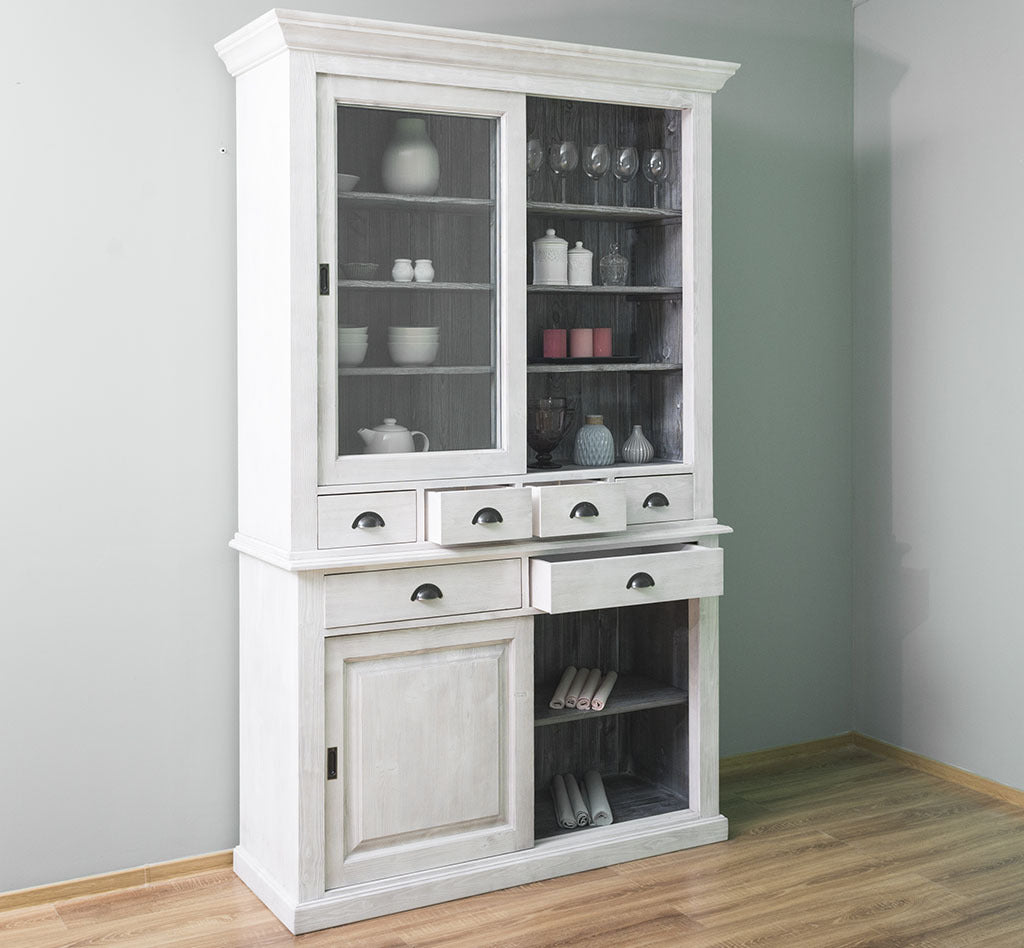 Porta lo charme dello stile provenzale shabby chic nella tua casa con questa raffinata vetrina libreria. Realizzata interamente in legno massello di pino al 100%, si distingue per la finitura grigio chiaro decapato all'esterno e un elegante interno verde scuro, creando un contrasto raffinato e originale. Dotata di ante scorrevoli in vetro, è ideale per esporre stoviglie, libri o oggetti decorativi. La parte inferiore comprende spaziosi cassetti e ante scorrevoli in legno, offrendo un pratico spazio di archiviazione. Perfetta per chi cerca librerie shabby chic online, questa vetrina unisce funzionalità e design, aggiungendo un tocco di eleganza a cucine, soggiorni o studi. Facile da mantenere pulita con un panno umido, garantisce qualità e durata nel tempo. Disponibile su misura e con colori personalizzabili.